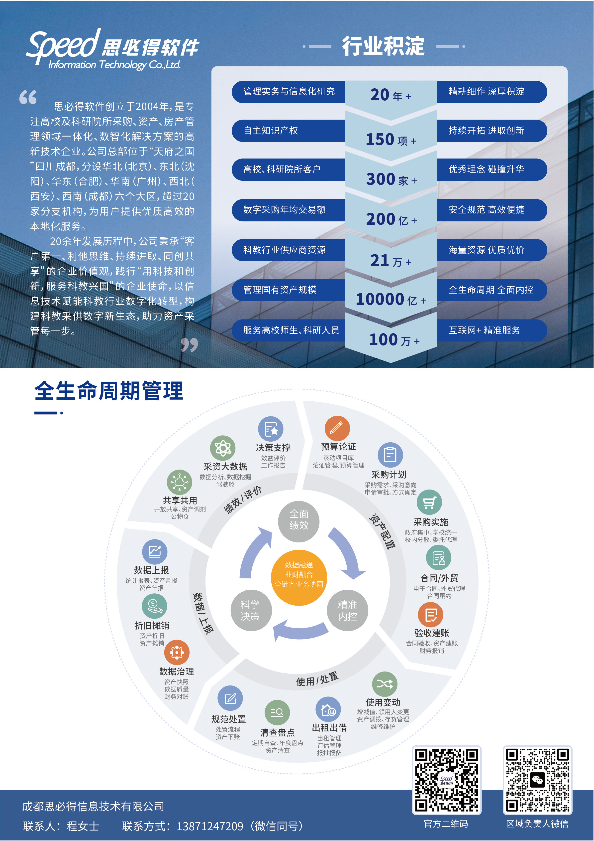 成都思必得信息技术有限公司成立于 2004 年,依托百年名校四川大学的学科资源与技术积淀,深耕高校领域服务,聚焦三大核心产品体系:高校采购、资产和房产管理系统。 公司自主打造的 "云采通" 平台,已汇聚 26 万余家优质供应商资源,构建起连接高校、供应商、代理机构、行业专家的多方共赢生态体系,为高校采购与资产管理提供全链条资源支撑。多年来,公司持续聚焦核心产品的技术创新与场景化应用,凭借自有专业研发团队的技术攻坚,结合众多大型高校项目的实践经验与理念融合,已具备相关产品原型的完全自主知识产权。目前,产品已成功服务于南昌大学、四川大学、清华大学、上海交通大学、浙江大学、湖南大学、华中科技大学、武汉大学等国内头部高校,形成了标杆引领的行业应用案例。 公司资质完备,已通过高新技术企业认定,累计持有近 100 项软件著作权及软件产品认证证书。作为博思软件集团旗下核心成员企业,依托集团资源优势,关联主体已成功承建教育部预算一体化平台、江西省框架协议电子化交易平台、江西省财政厅一体化二期政府采购监管平台等重大政务信息化项目,具备深厚的行业积淀与技术服务能力。